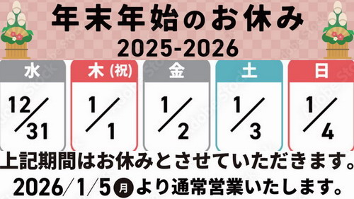休み期間中のご注文・お問い合わせに関しては、1/5(月)より随時発送・ご連絡させて頂きます。ご迷惑をお掛け致しますが宜しくお願い致します。